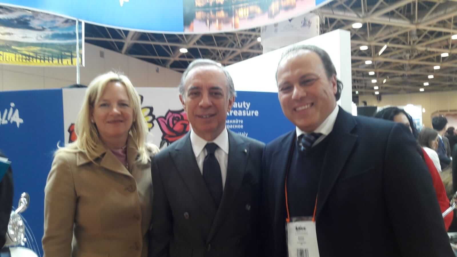 Karen Lawrence Terracciano moglie dell’ Ambasciatore, Pasquale Q. Terracciano Ambasciatore Italiano a Mosca, Andrea Tanzini Presidente ANCE Siena in visita alla MITT Mosca.